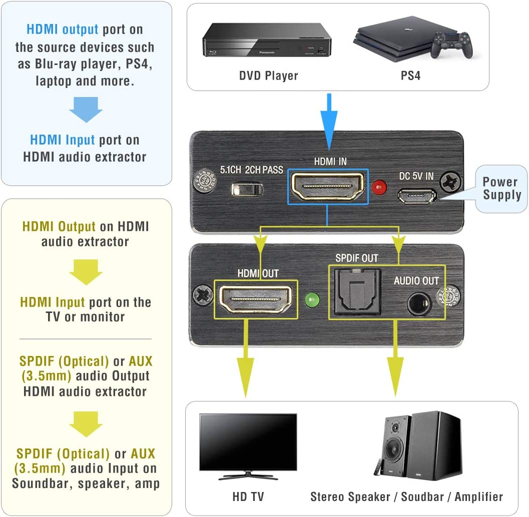 4K HDMI to HDMI + Audio Extractor – Optical TOSLINK & Analog L/R Output –