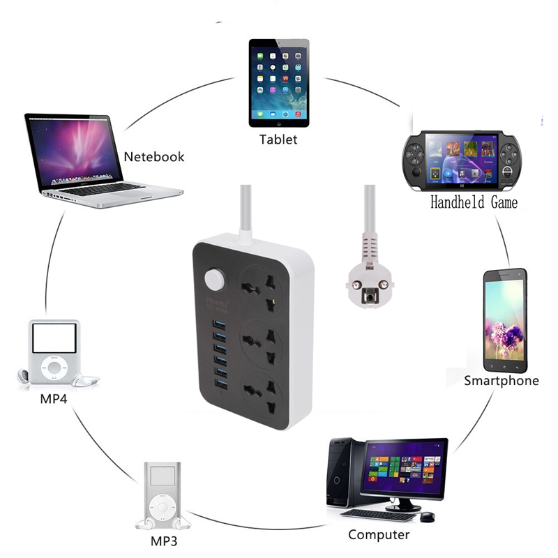Designed for convenience, the usb hub power strip Oman features a clean, space-saving design that fits neatly on desks or behind entertainment centers. Its universal compatibility means you can charge iPhones, Android phones, power banks, smartwatches, wireless earbuds, and more—all from a single 6 usb power bar. The intelligent auto‑detect technology optimizes charging current for each device, delivering fast, safe, and efficient charging every time.