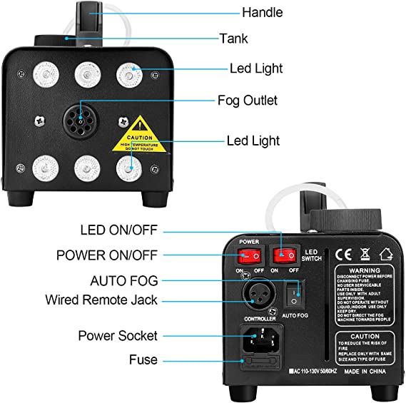 Featuring 13 colorful LED lights, the machine offers vibrant lighting effects, including red, blue, green, and mixed colors like cyan, fuchsia, yellow, and white. These lights can operate independently or in sync with the fog, enhancing the ambiance of any occasion.