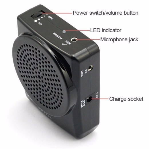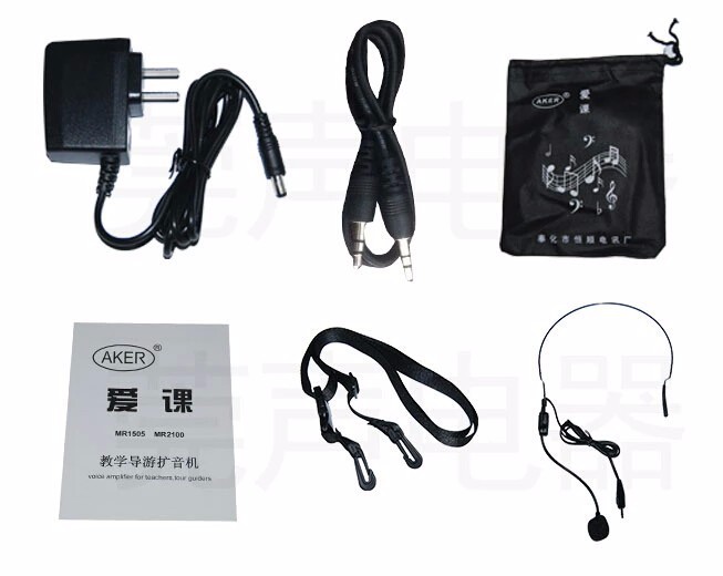 The Aker MR1505 amplifier comes with a comfortable headset microphone and offers dual input ports for both microphone and MP3 devices, allowing simultaneous speaking and audio playback. Its built-in rechargeable battery provides 10-15 hours of continuous use, making it perfect for long sessions.