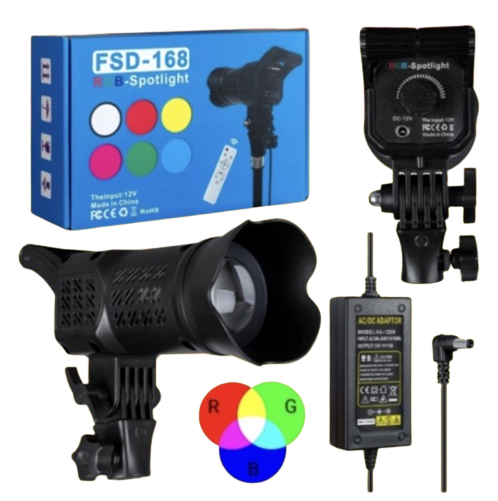 Bring vibrant, professional‑grade lighting to your events, photo shoots, and home decor with the FSD‑168 RGB Spotlight. This 42 W COB LED spotlight offers 15 vivid RGB color modes, adjustable brightness (10–100%), and dynamic lighting effects like flashing, fading, and strobe—all controlled via the included wireless remote.