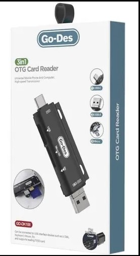Introducing the Godes GD DK108 3-in-1 OTG Card Reader, a versatile and compact solution for your data transfer needs in Oman. Designed with USB-C, Micro USB, and USB 2.0 interfaces, this multi-function card reader ensures seamless connectivity with a wide range of devices, including smartphones, tablets, and computers.