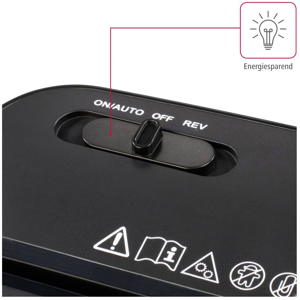 This strip-cut shredder features an automatic start/stop function, activating the shredding process upon paper insertion and halting once completed. The reverse function is particularly useful for clearing paper jams, enhancing user convenience.