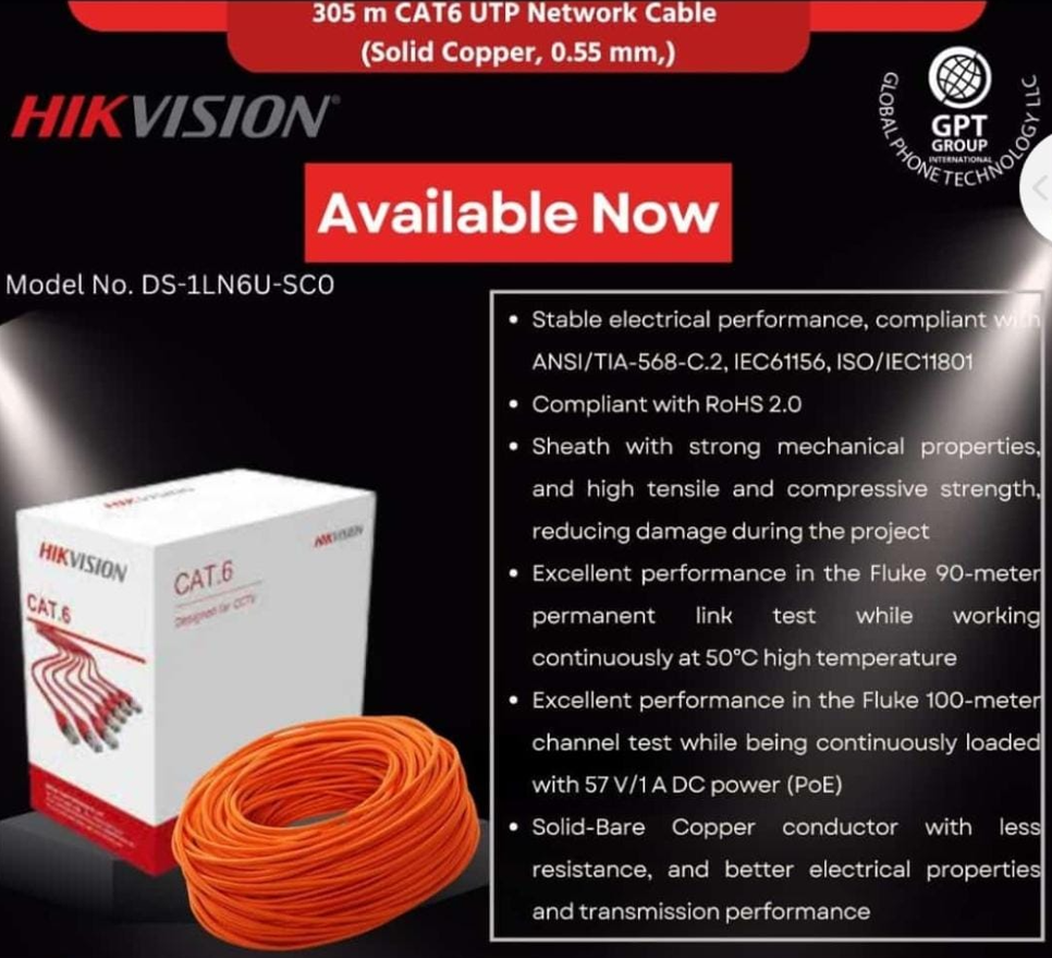 Ensure stable and high-speed connectivity with the premium Copper Ethernet Cable in Oman designed for professional networking performance. The Hikvision Cat6 UTP cable delivers reliable data transmission for homes, offices, and large installations.