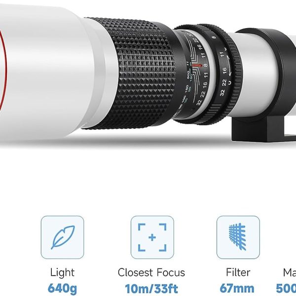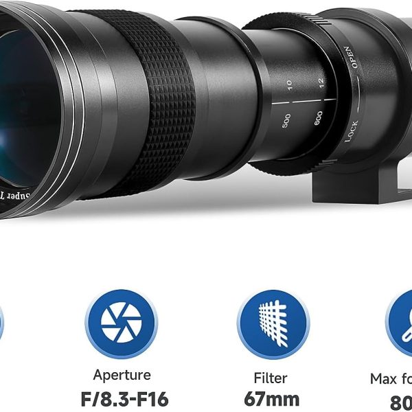 Jintu 500mm f/7.0–f/32 Super Telephoto Manual Lens — T‑Mount Kit for Nikon & Canon (Lightweight, Tripod Collar)