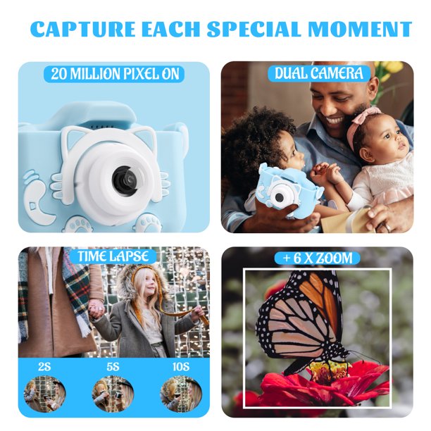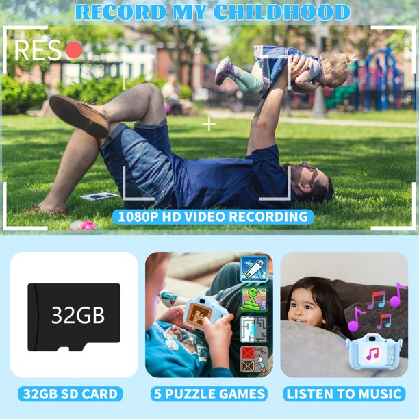 The camera comes with a 32GB SD card slot, providing ample storage for countless memories. Kids can explore their creativity with built-in fun filters and frames, adding a playful touch to their photos. The dual-lens setup enables easy switching between regular and selfie modes, ensuring they never miss a moment.