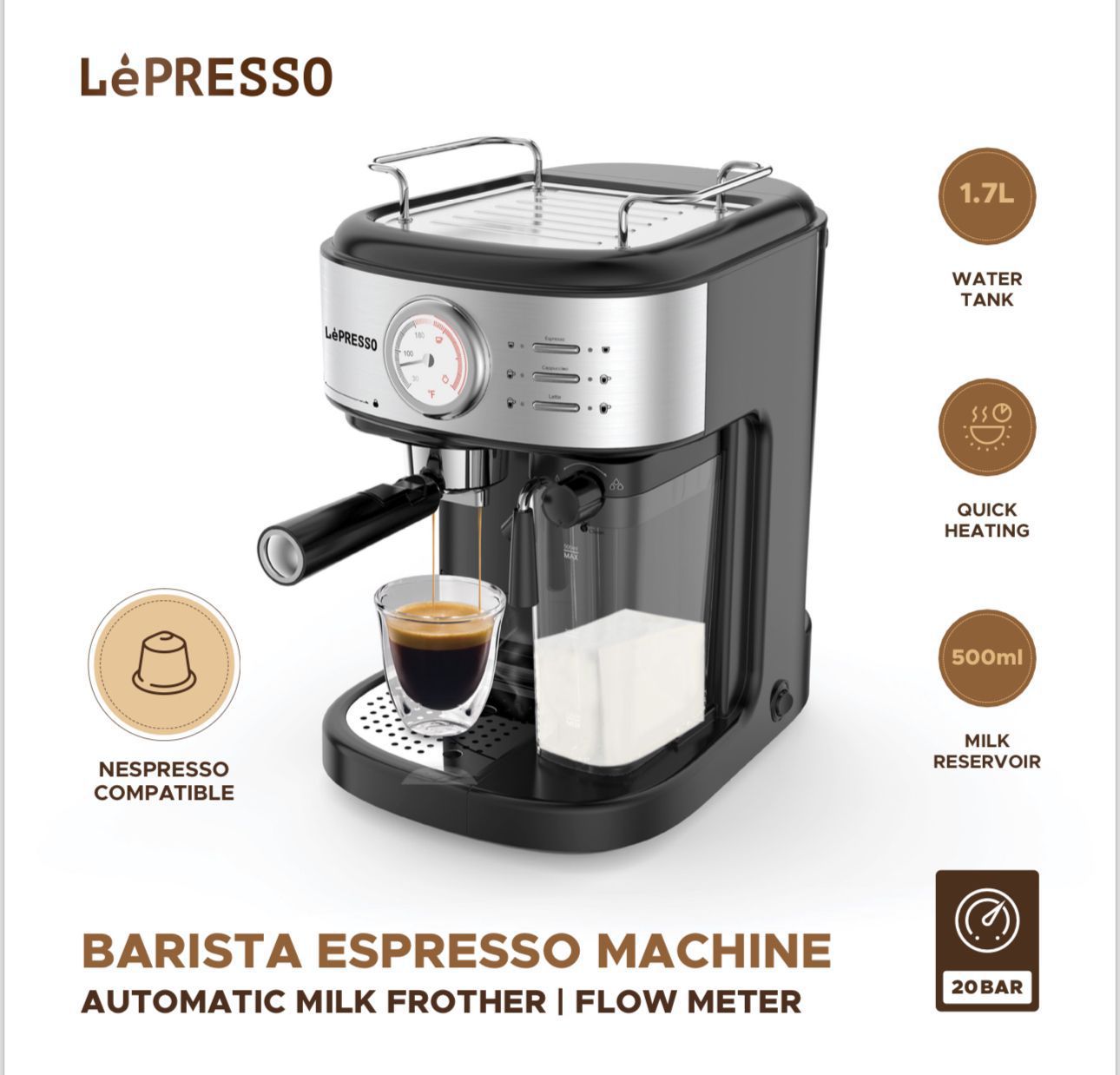 LePresso Barista Espresso Machine – 20 Bar Pump, Automatic Milk Frother & Flow Meter –