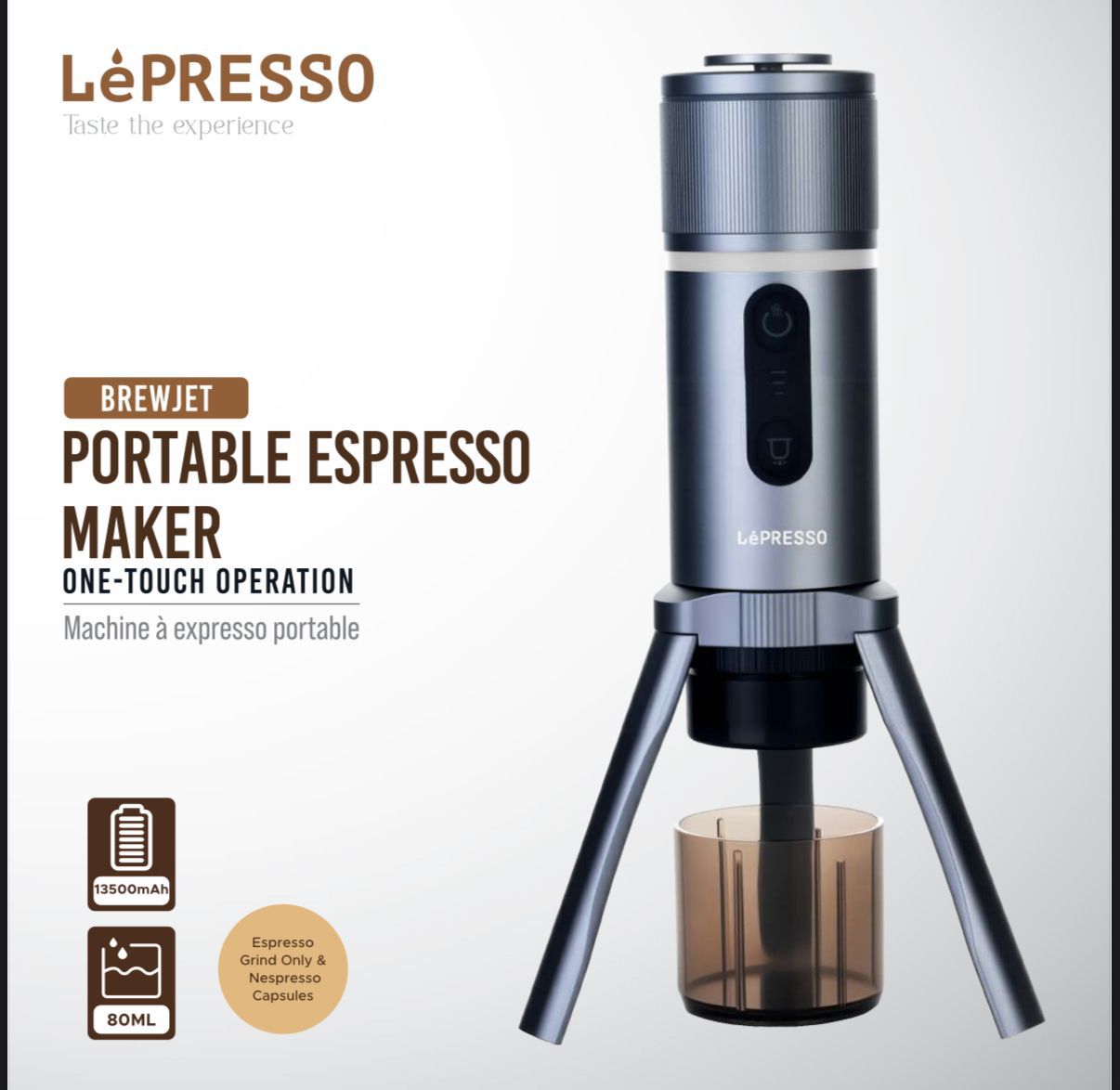 Whether you’re camping in the mountains or working at your office desk, the LePresso Brewjet promises consistent espresso quality with amazing convenience. Compact, fast, and versatile—the ultimate portable espresso maker that caters to your on-the-go lifestyle.