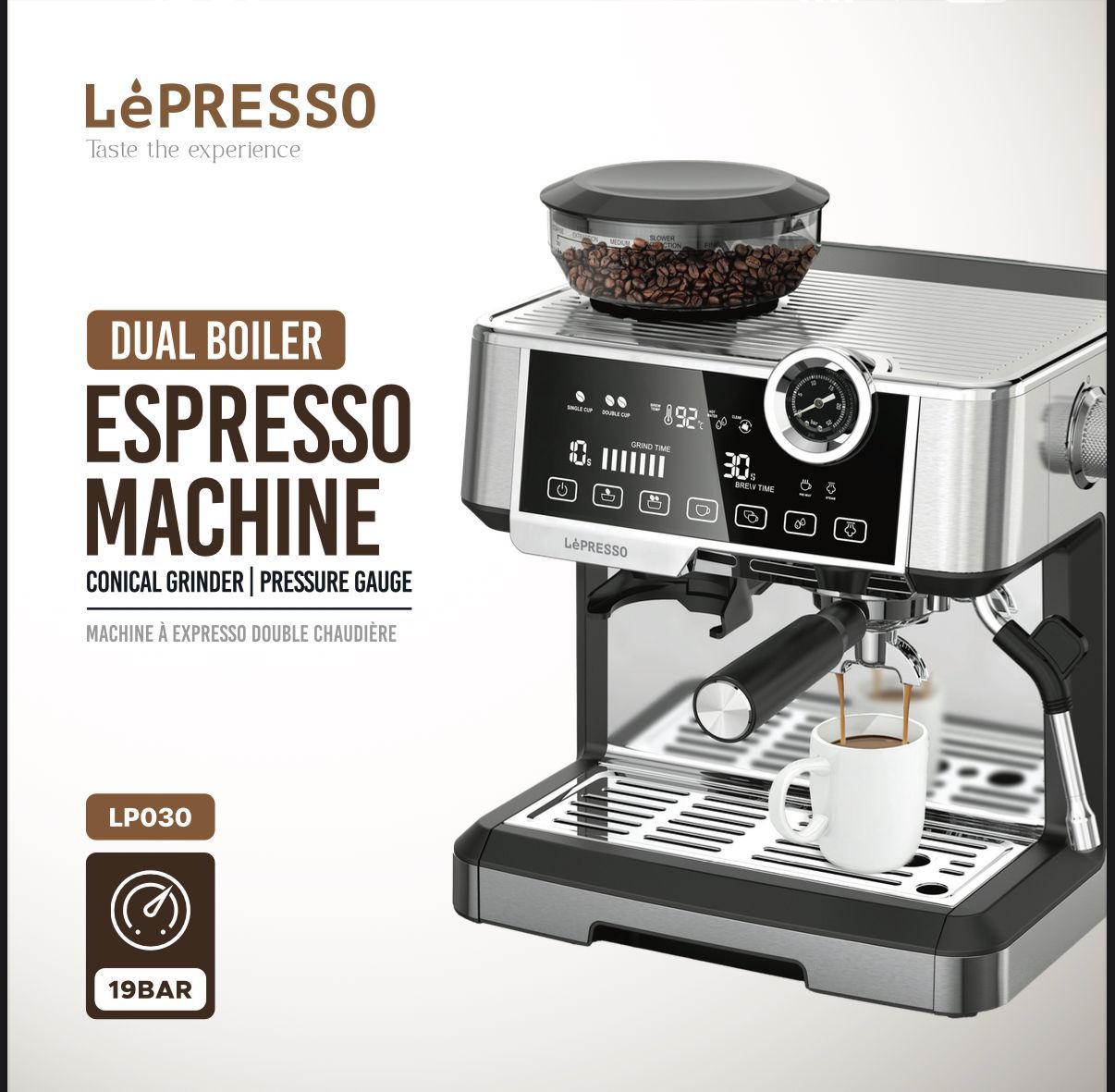 Lepresso Dual Boiler Espresso Machine LPCFFM0030 – 19 Bar Pressure, 2.8L Water Tank, Adjustable Grinder, Stainless Steel,