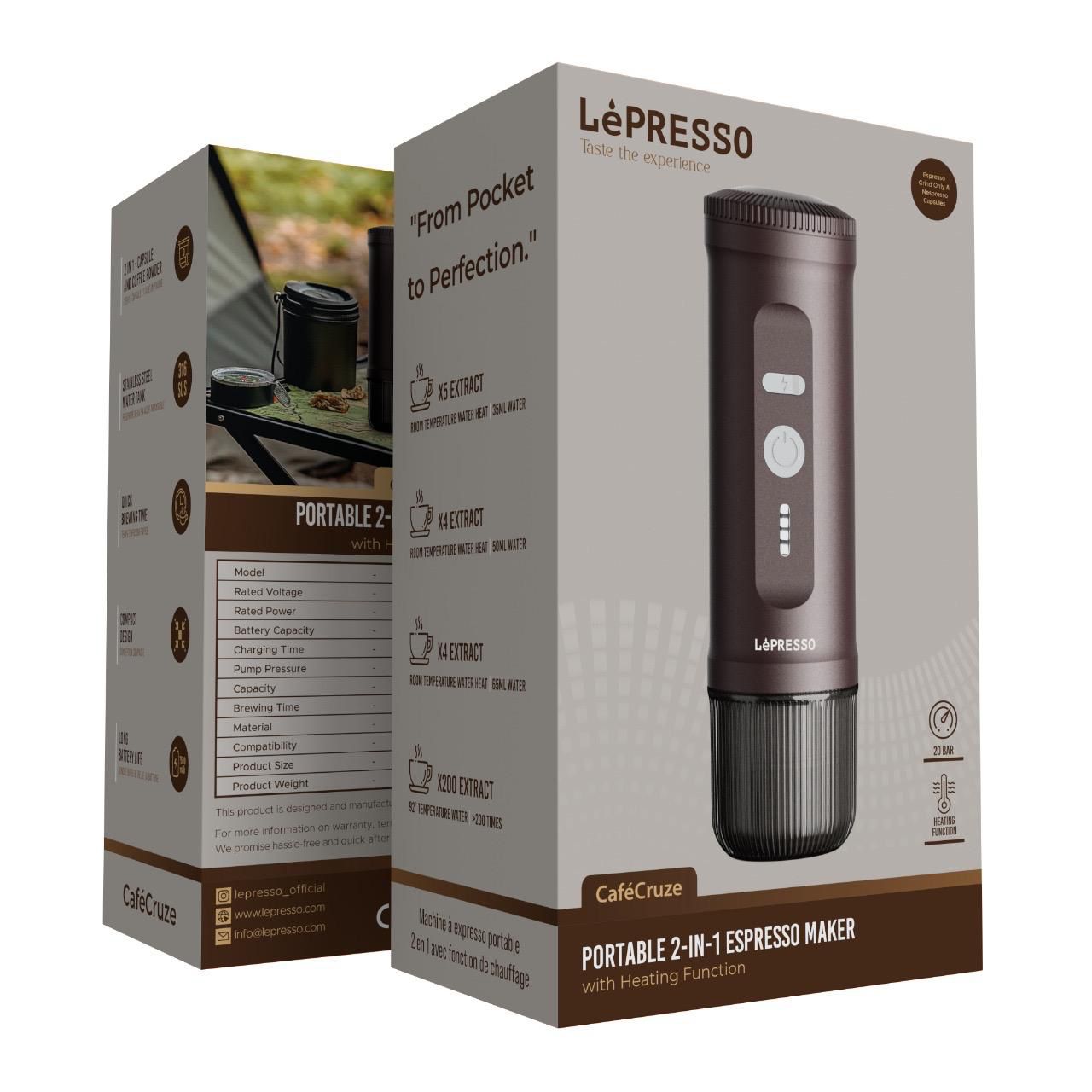LePresso Portable 2-IN-1 Espresso Maker LPCFFPCM0095-GY – Heating + Travel Espresso, 20-Bar, Rechargeable
