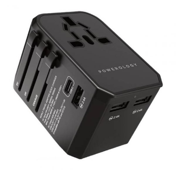 Powerology Universal Travel Adapter 2.4A + PD 45W – Multi-Port Fast Charger for Global Use (P45PDUTVBK)