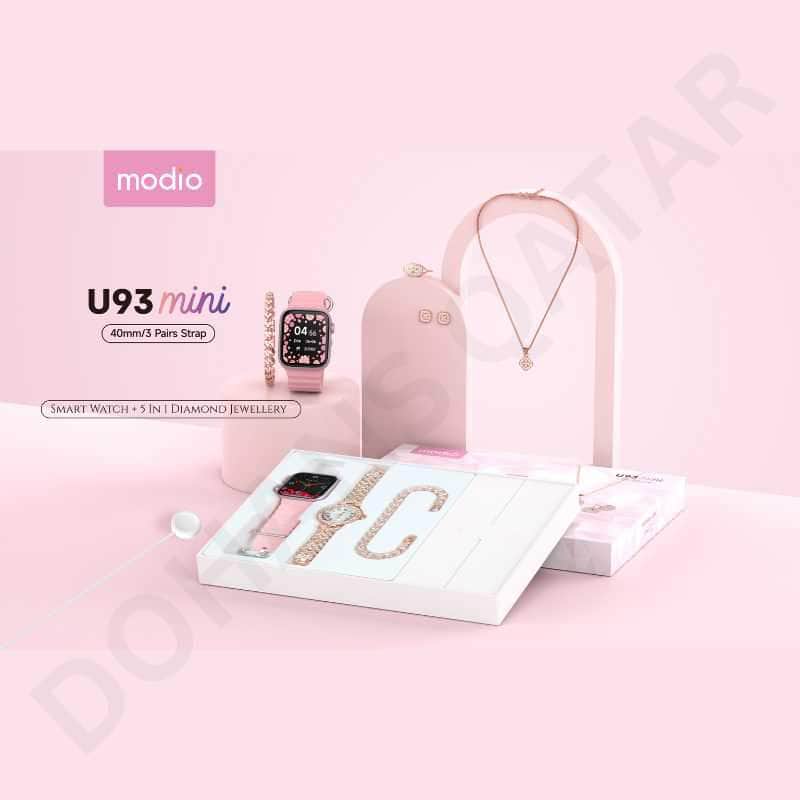 Modio U93 Mini Smart Watch with 5-in-1 Diamond Jewelry Set – 40mm HD Display, 3 Straps, Bluetooth Connectivity – Compatible with Android & iOS