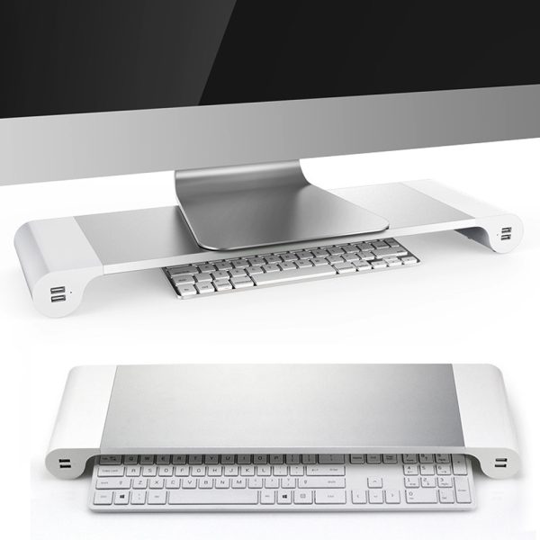 Monitor Stand “Space Bar” Silver – Aluminium Ergonomic Riser with USB Hub & Storage –