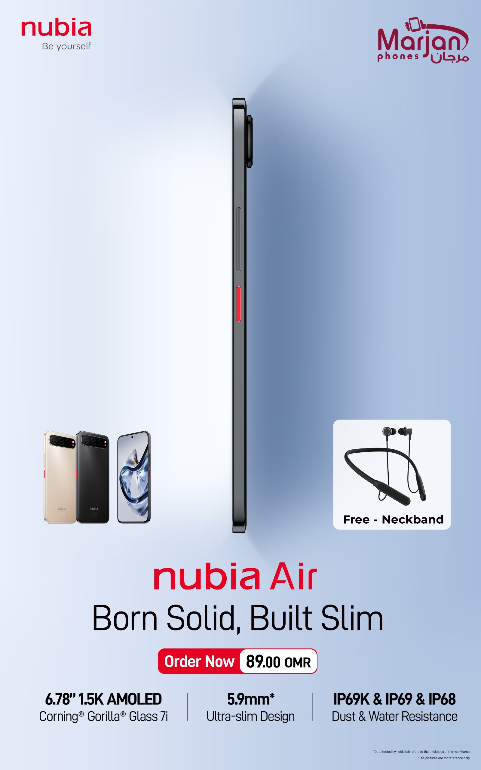Experience powerful performance and modern design with the Nubia AIR-20 smartphone, now available at Sky Gadgets Oman. Built for speed and multitasking, this advanced nubia air 20 Oman model features an impressive 20GB RAM phone Oman configuration (8GB physical + 12GB virtual) and a massive 256GB storage mobile, giving you smooth performance and ample space for apps, games, and media.