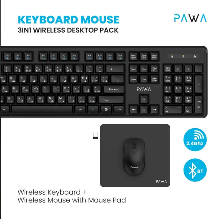 Enhance your workspace with the Pawa 3-in-1 Wireless Desktop Pack (KMP24BTW), now available at Sky Gadgets in Oman. This comprehensive set includes an ergonomic keyboard, a responsive wireless mouse, and a durable mouse pad, offering a seamless and clutter-free computing experience.