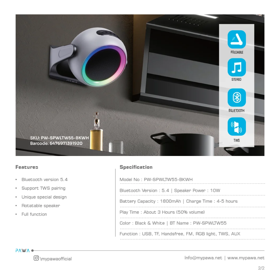 Elevate your audio setup with the Pawa ARIA Wall & Desktop Speaker SPWLTW55, a versatile combo of style and sound from Sky Gadgets Oman. This desktop speaker with RGB light delivers immersive sound via Bluetooth connectivity, offering crisp highs and punchy bass that bring music, movies, and gaming to life. Designed for both mounting on the wall or placing on your desk, the wall desktop speaker Oman users will love its flexibility and clean design.