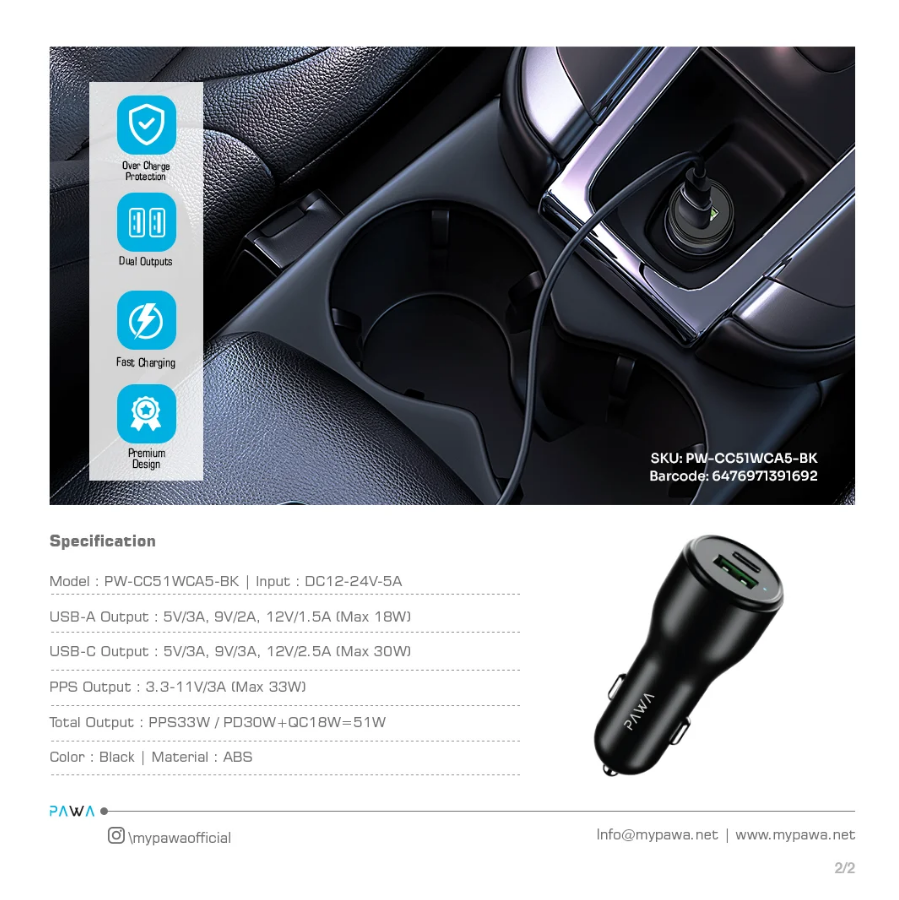 Power up your devices on the go with the reliable Dual Port Car Charger in Oman by Pawa. Designed for speed and convenience, this 51W charger features both Power Delivery (PD) and Quick Charge (QC) technology, ensuring fast and efficient charging for multiple devices at once. Whether you’re commuting or traveling, this Dual Port Car Charger in Oman keeps your devices ready when you need them most.
