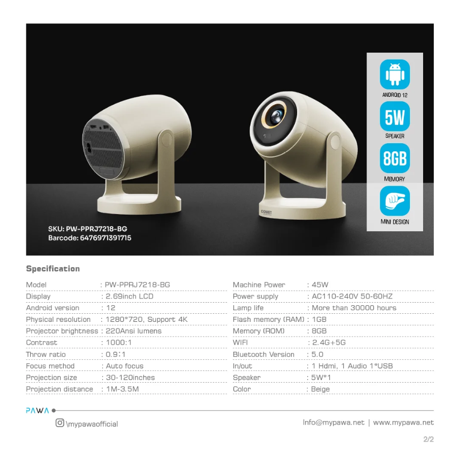 Transform any space into a cinema with the Android Projector in Oman by Pawa Mini Comet PPRJ7218. Compact yet powerful, this projector delivers bright and clear visuals for an immersive viewing experience anywhere.