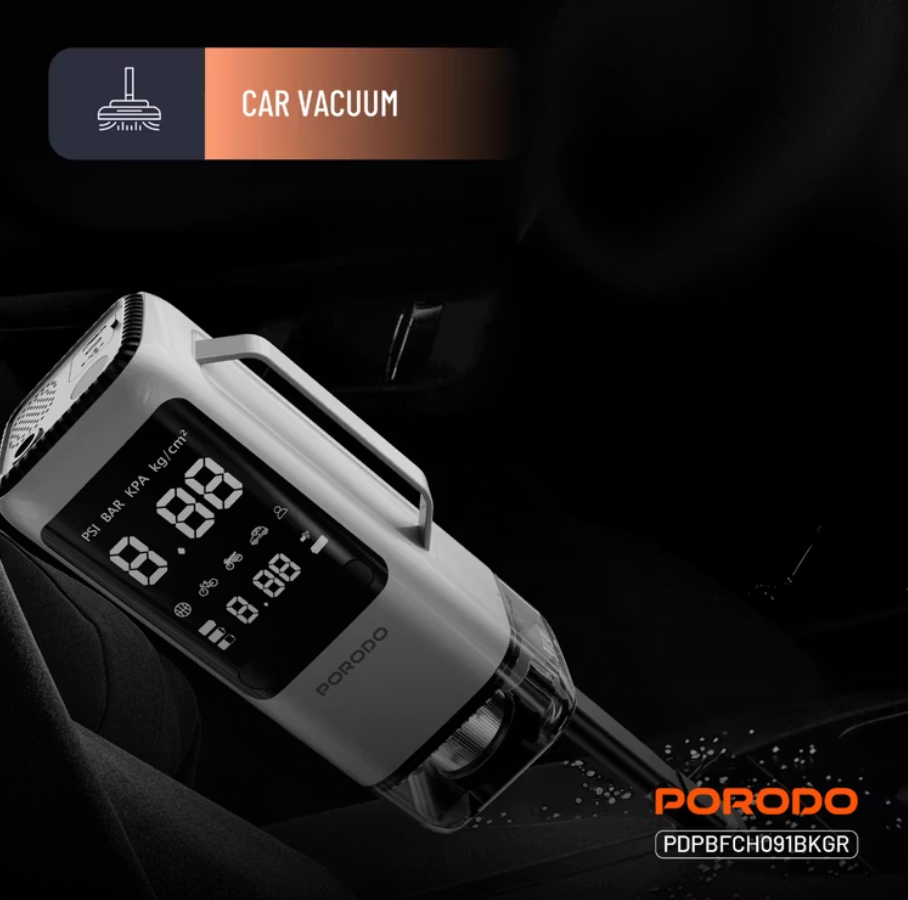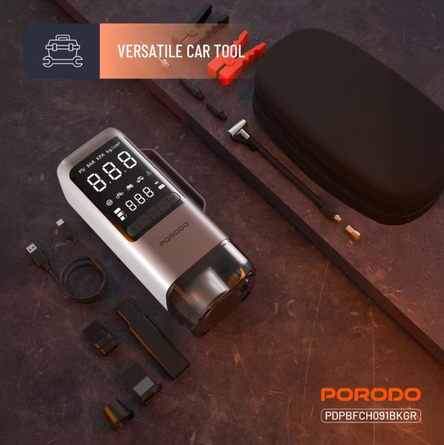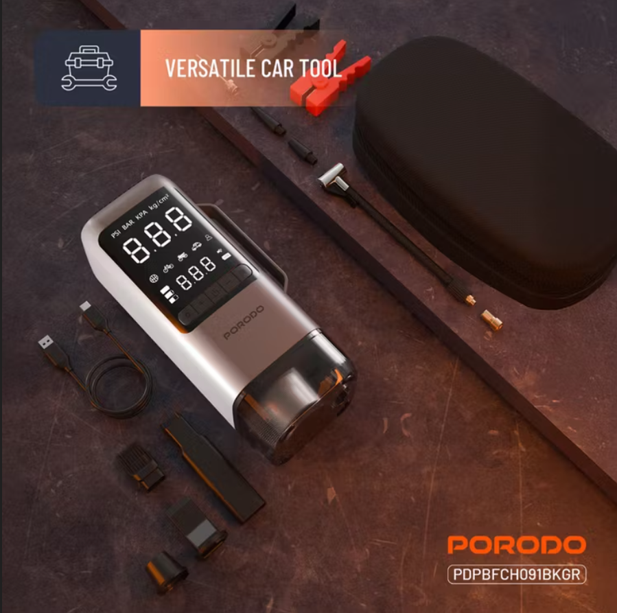 Stay prepared for any situation with the Porodo 6 in 1 Multifunction Power Tool Jump Starter Air Comp Power Bank PDP-CH091-BKGR, now available at Sky Gadgets Oman. This powerful device combines car jump starter Oman, Porodo power bank Oman, and air compressor functions into one compact, reliable tool – making it the perfect companion for drivers, travelers, and outdoor enthusiasts.