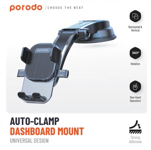 Porodo Auto-Clamp Dashboard Mount (PD-FE1CRM-BK) – Universal Design, 360° Rotation, One-Hand Operation, Strong Adhesive,