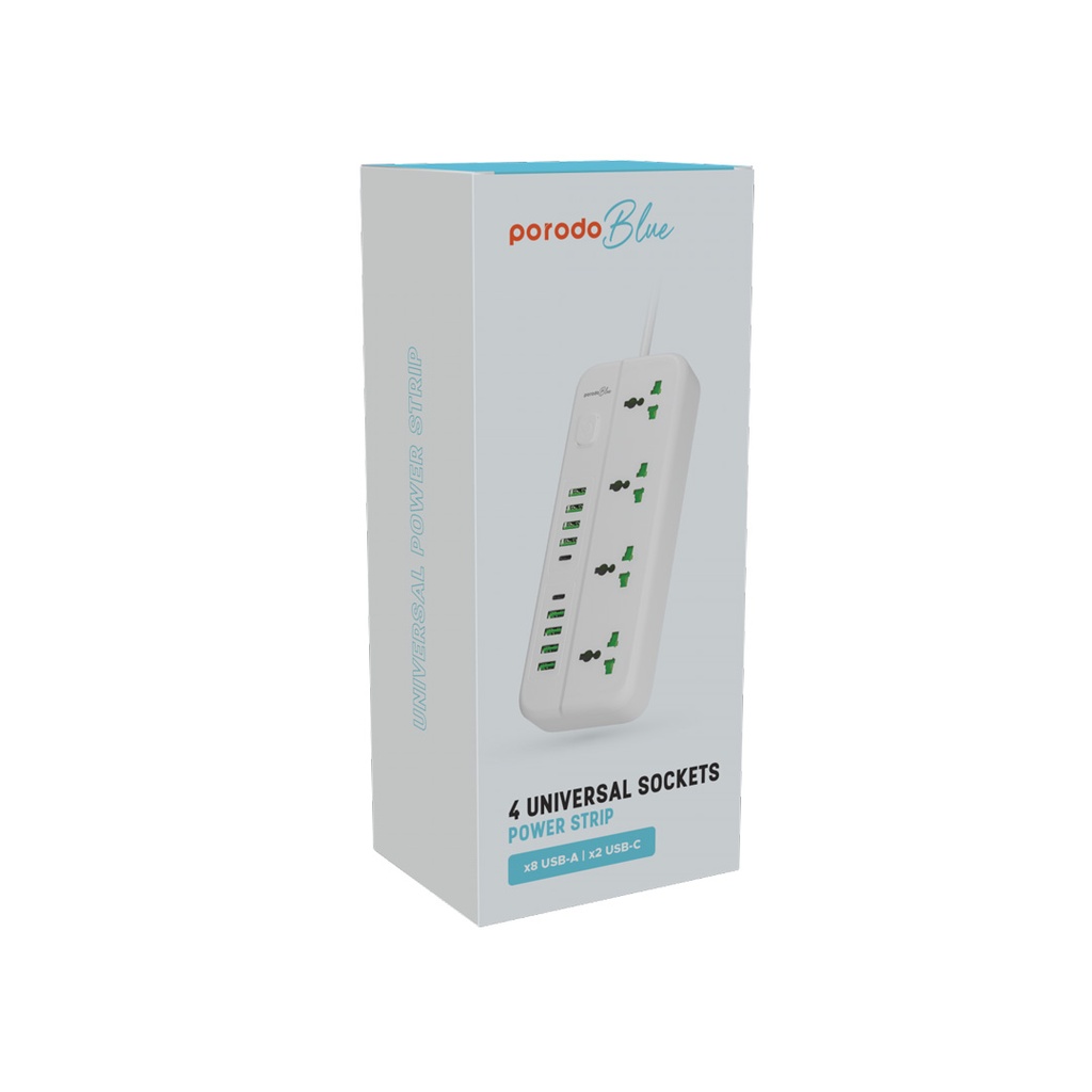Porodo Blue 4-Socket Power Strip with 8 USB-A & 2 USB-C Ports (PB-4ACPS2C8A-WH) – 2000W, 3m Cable, Universal Compatibility,