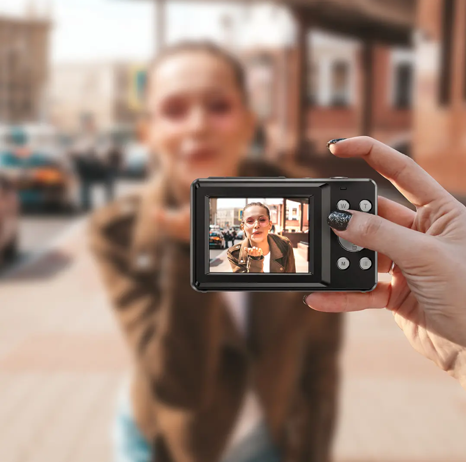 Featuring dual‑screen display Oman, the 2.4″ HD IPS front screen plus the 1.3″ rear screen are perfect for selfies, vlogging, or framing tight shots with ease. The auto‑focus & fixed focus modes adapt to both dynamic and static scenes. With an 800 mAh battery, enjoy up to 100 min runtime per charge—USB‑C recharging ensures quick power top-ups.