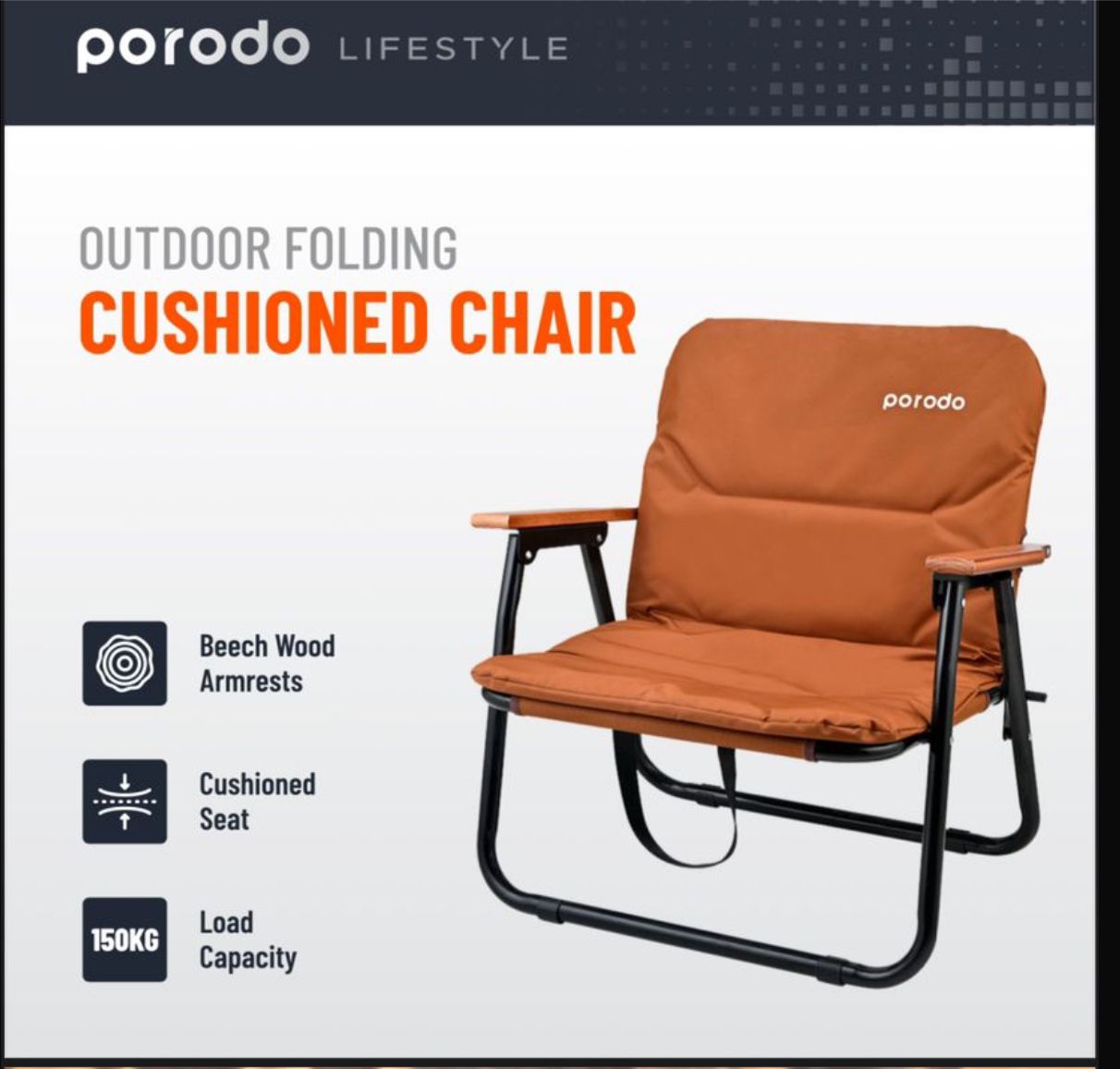 Porodo Lifestyle Camping Foldable Cushioned Chair – Lightweight Aluminum Frame, 150kg Load Capacity,