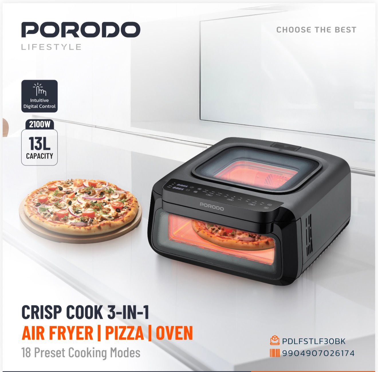 Porodo Lifestyle Crisp Cook 3-in-1 Air Fryer & Pizza Oven (13 L / 2100 W) – Model PDLFSTLF30BK