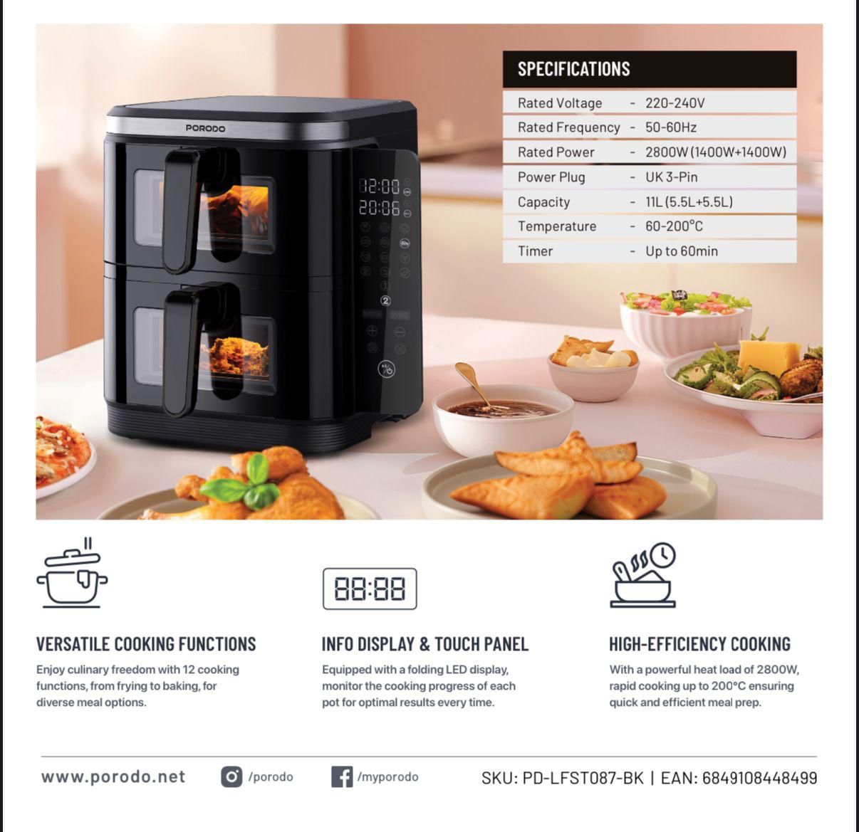 Porodo Lifestyle Double Stack Air Fryer – 11L Capacity, 2800W Power, 12 Presets, Touch Panel,
