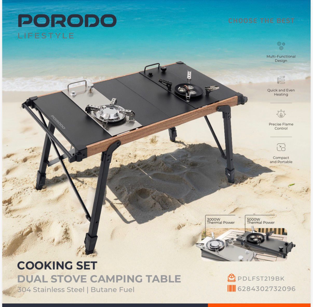 Elevate your outdoor adventures with the Porodo Lifestyle Cooking Set Dual Stove Camping Table (PDLFST219BK) — a rugged dual burner camping table designed for versatility and performance. This Porodo cooking set features two powerful stoves: a 3,000 W one-eye burner and a 5,000 W three-eye burner, giving you reliable high heat for any camp cooking task. Built with 304 stainless steel, the stoves are durable, rust-resistant, and optimized for quick and even heating.