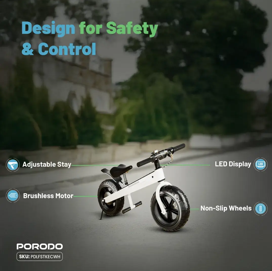 Porodo Lifestyle JoyCruiser Kids Electric Bike – Rechargeable Ride-On, LED Lights & Parental Remote |
