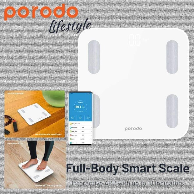 Porodo Lifestyle Smart Body Scale PD-BF1321BT-WH – Bluetooth Digital Weight & Body Composition Analyzer