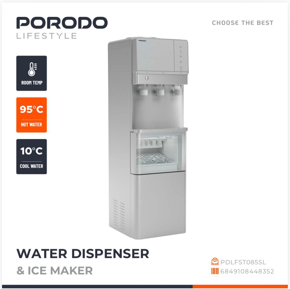 Porodo Lifestyle Water Dispenser & Ice Maker – Hot-Cold Floor Dispenser with 1.1 kg Ice Storage, 220–240 V (Silver)