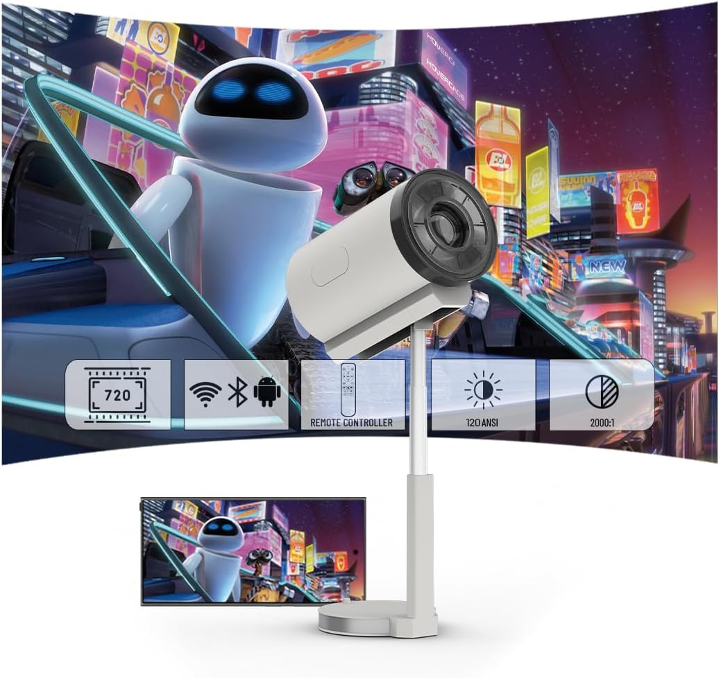 Features: Wireless screen mirroring, telescopic stand, remote controller, multi-angle projection