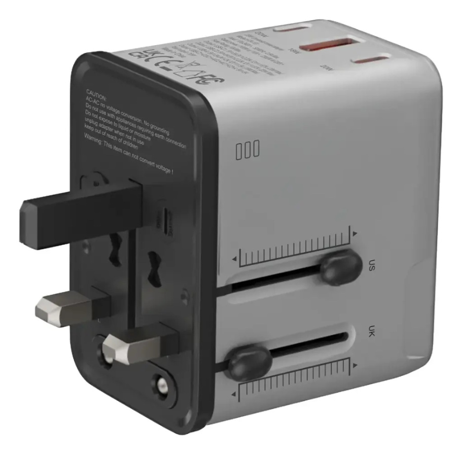 Plug Types: EU, UK, US sliding/rotating pins (universal compatibility)
