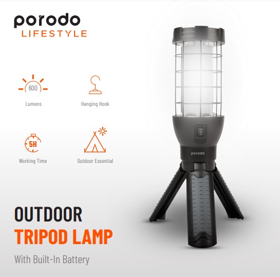 Porodo Outdoor Tripod Lamp (PD-LSTRILMP) – 600LM Rechargeable LED Light with Dual 1200mAh Batteries & Type-C Charging,