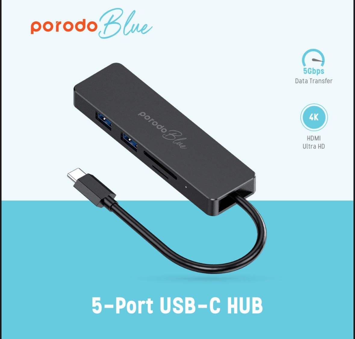 Porodo PB‑51HBC‑BK – 5‑in‑1 USB‑C Hub (4K HDMI, USB‑A, SD/MicroSD, 5 Gbps)