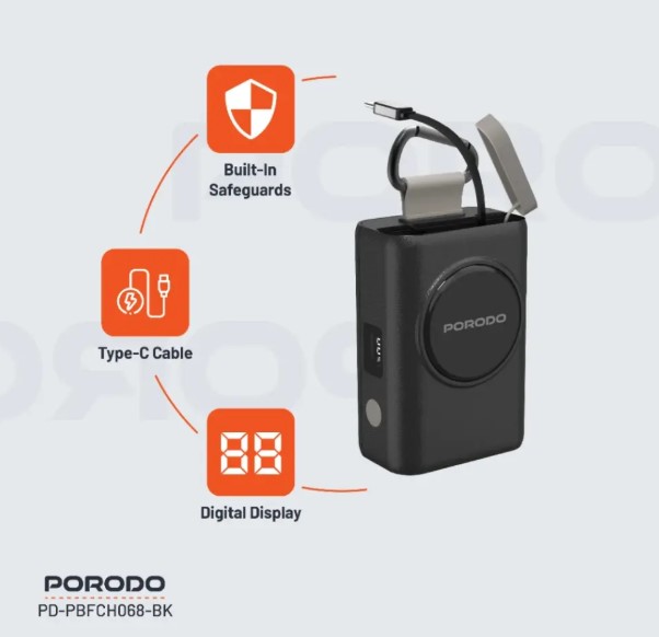 Keep your devices charged flawlessly with the Porodo PB068 power bank Oman, a sleek 10,000 mAh backup battery designed for fast, reliable power delivery. The Porodo PB068 45W PD power bank features a built-in retractable Type‑C cable reaching up to 70 cm, eliminating the need to carry extra cords. It delivers 45W fast charging via USB‑C input/output, letting you power laptops, tablets, or smartphones quickly and efficiently.