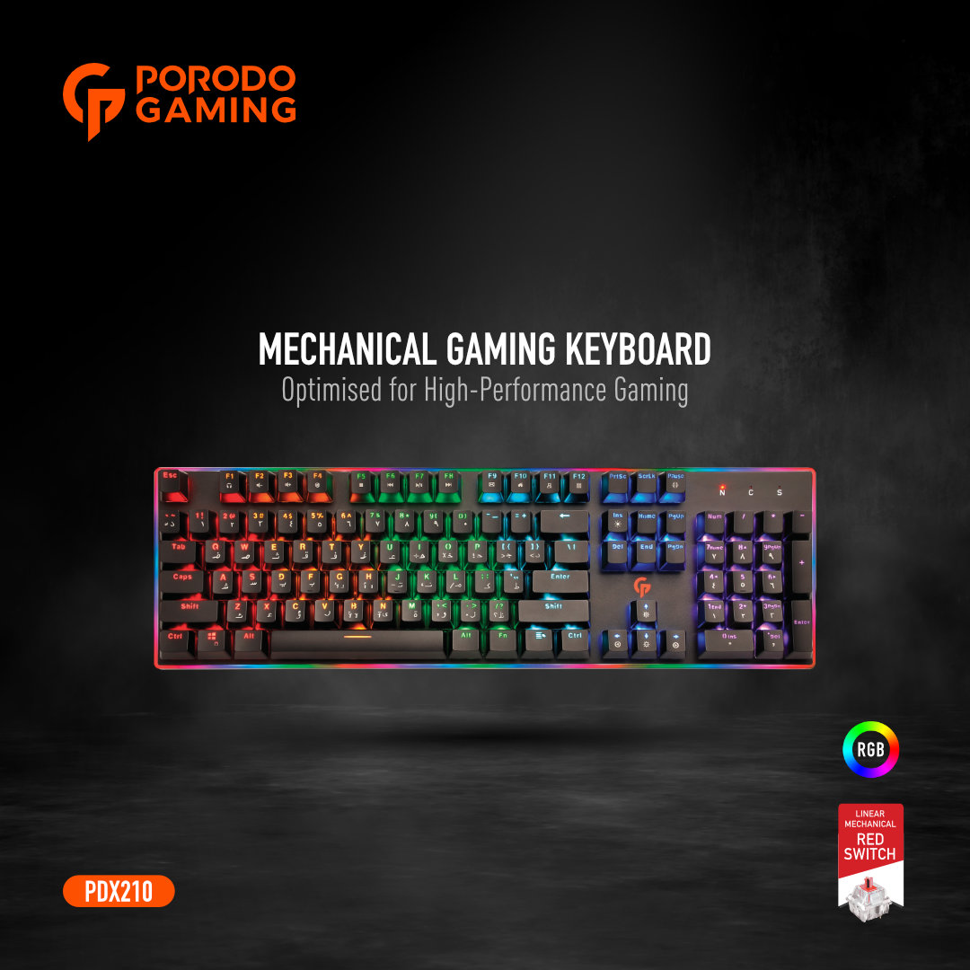 Porodo PDX210 Mechanical Gaming Keyboard – 104 Keys, RGB Backlit, Anti-Ghosting, English/Arabic Layout