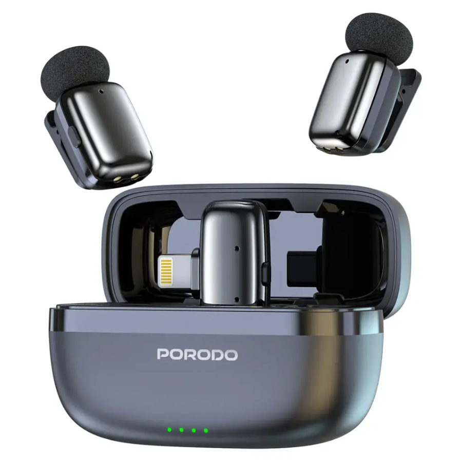 Elevate your content creation in Oman with the Porodo Wireless Lavalier Microphone LFST189, a wireless mic for iPhone that’s perfect for vlogging, interviews, and live streaming. Featuring a Lightning Connector mic with plug-and-play mic simplicity, this Porodo lavalier microphone offers on-the-go convenience and clear, professional audio.