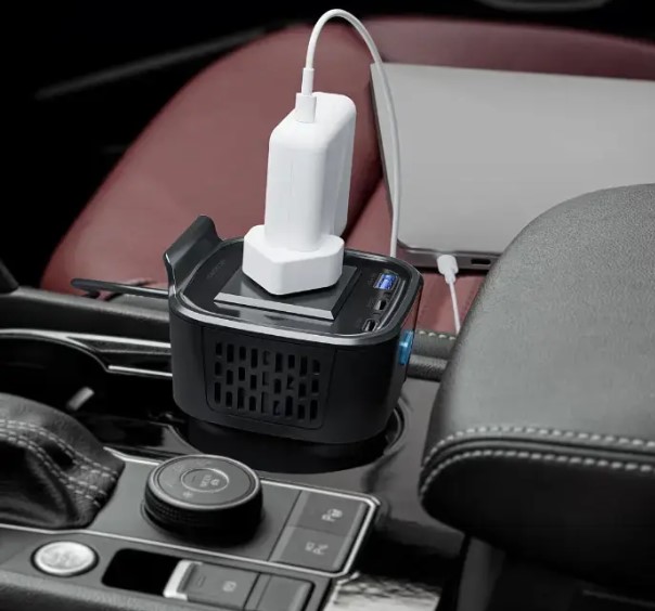 Powerology 150W Cup Holder Power Inverter – Dual USB-C & USB-A QC3.0 Car Charger (P150INV)