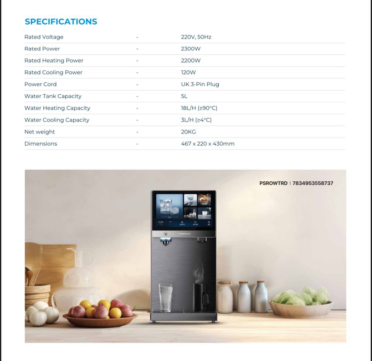 Powerology 4-Stage Reverse Osmosis Water Purifier Dispenser PSROWTRD – 5L Tank, Hot & Cold Water, 7″ Touch Display,