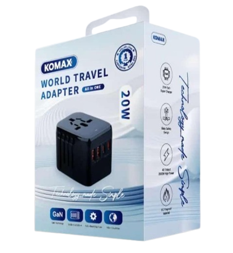 Komax All-in-One 20W World Travel Adapter – Universal Compatibility with USB-C and USB-A Ports,