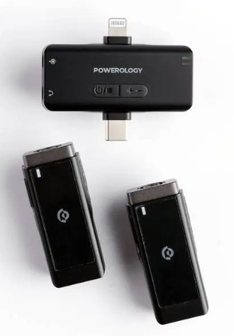 Powerology Wireless Lavalier Microphone Duo – Lightning & Type-C Connectors, Noise-Cancelling Clip-On Mic (PWMIC2)