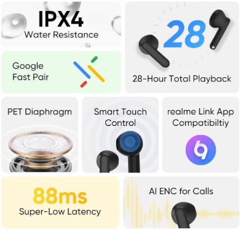 Compatibility: Android & iOS via Realme Link app and Google Fast Pair