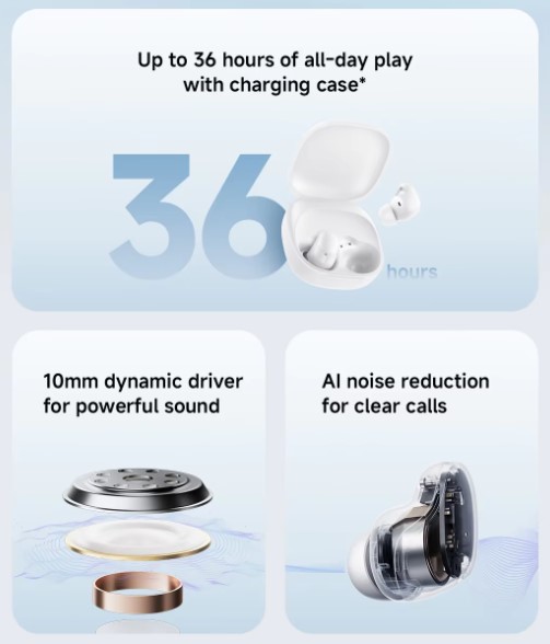 With an impressive 36-hour battery life, you can enjoy uninterrupted music and calls throughout the day. The AI noise reduction technology filters out background noise, providing clear call quality even in noisy environments.