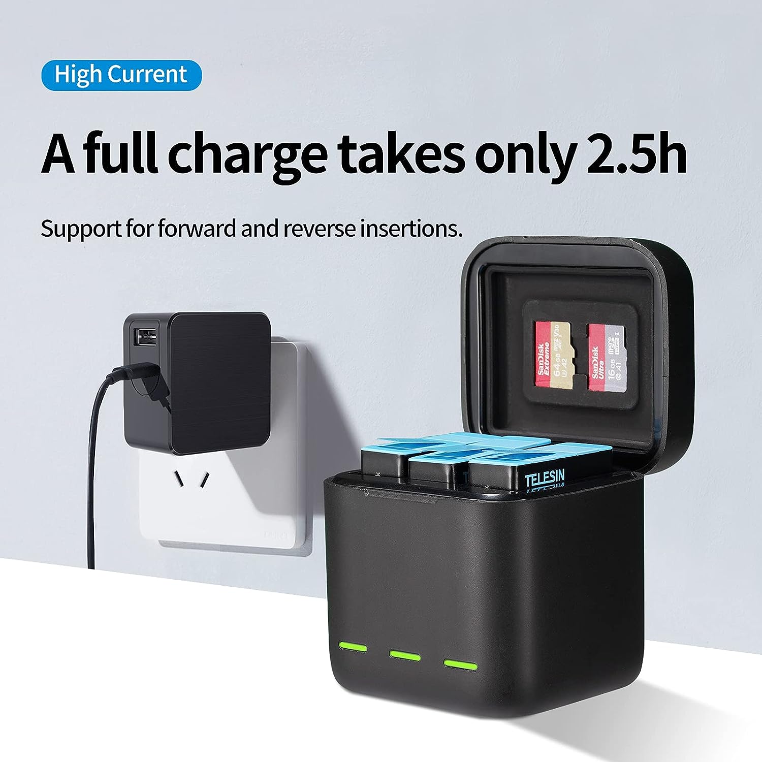 Effortlessly store and recharge your GoPro batteries with the Telesin GP‑BCG‑901, available now at Sky Gadgets Oman. This Telesin charging box Oman is designed to handle up to three GoPro batteries simultaneously—perfect for shoot-intensive sessions. With a high-current USB‑C input (5 V/2.4 A), the GP‑BCG‑901 battery charger fully powers your batteries in approximately 2.5 hours. The sleek cube design includes a magnetic lid, anti‑slip silicone base, and built-in slots to safely store two micro‑SD cards along with your batteries.