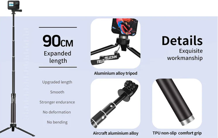 Elevate your content capture with the Telesin GP-MNP-090-S Monopod / Selfie Stick, a versatile tool that combines a selfie stick tripod combo into a lightweight, extendable solution. Crafted from aviation aluminum alloy, this Telesin monopod 090-S is durable yet portable—ideal for travel, vlogging, and action shots. The stick extends up to about 90 cm (35.4″), giving you extra reach for creative framing and dynamic angles.