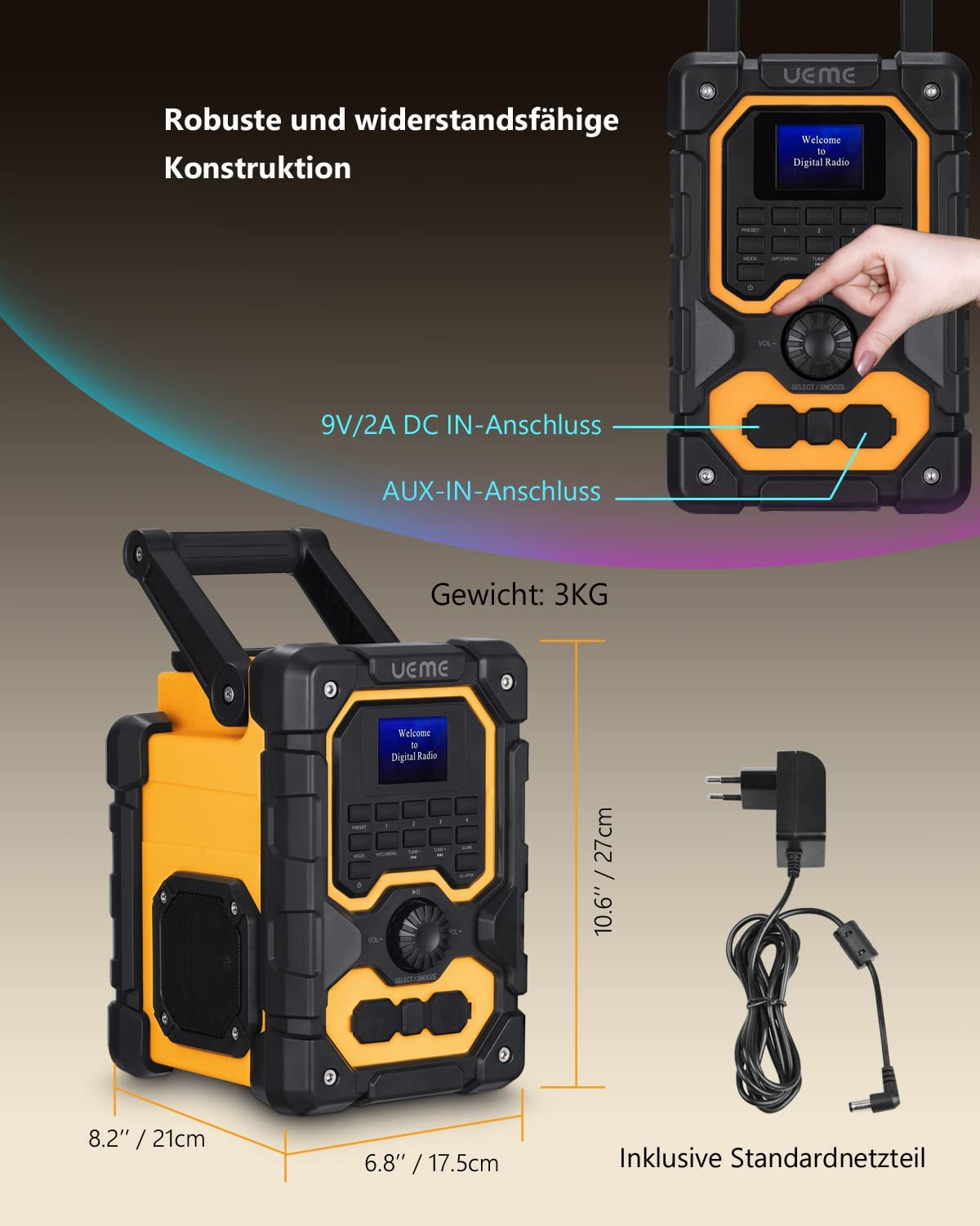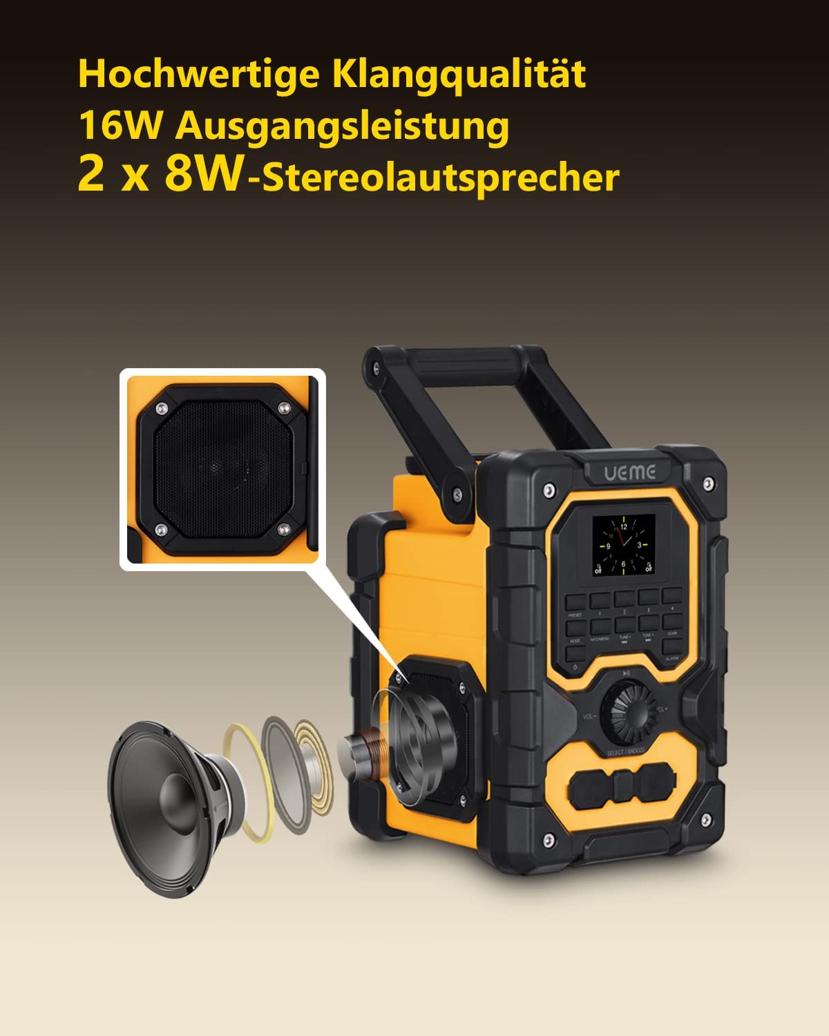 UEME Robuste BGL1 DAB+ FM Bluetooth Radio – 16W Stereo Sound, 2.5″ LCD Display, USB Charging, AUX Input, Splash-Proof Design –