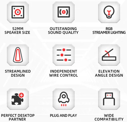 The SG-500 stereo speaker features dynamic RGB lighting, adding a captivating ambiance to your gaming environment. Its USB powered design and 3.5mm audio jack provide easy connectivity to PCs, laptops, and other compatible devices.